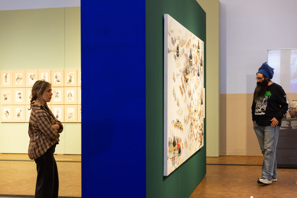 Anchoring the exhibition, Erdenebayar Monkhor reinterprets his iconic horse imagery – long a symbol of freedom and resilience of nomads — in sculptural stillness that speaks to the shifting realities of urban life. Baatarzorig Batjargal layers political commentary, pop culture, and spirituality in rich visual language to mirror Mongolia’s modern contradictions. Lkhagvadorj Enkhbat portrays marginalized urban figures and forgotten spaces of Ulaanbaatar with empathetic realism, while Odmaa Uranchimeg merges Buddhist iconography with modern abstraction. Gerelkhuu Ganbold reimagines folklore and historical motifs through Mongol painting technique, reflecting the tension between urbanization and fading traditions, and Nyam-Ochir Oyunpurev revitalizes traditional calligraphy into expressive compositions celebrating Mongolia’s cultural continuity.